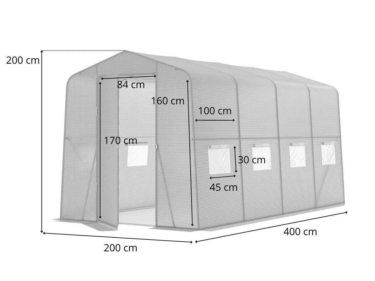 Solarul tip tunel pentru grădină cu cadru metalic are o lățime de 2 m și o lungime de 4 m, astfel încât suprafața totală de cultivare este de 8 m2. Orice tip de cultură va prospera sub o astfel de protecție: fructe, legume și, de asemenea, flori ornamentale. Chiar și în caz de vreme nefavorabilă, plantele vor crește bine. Tunelul cu folie are o înălțime de 2m, astfel încât să puteți munci în poziție dreaptă și să faceți activități de grădină confortabil, chiar și pentru persoanele mai înalte. Ușile metalice de 84x170 cm de pe o parte a tunelului permit intrarea sau ieșirea comodă. Acestea garantează accesul rapid la interior fără a fi nevoie să rulați în sus și în jos ușa cu fermoar. O intrare rulantă lată de 120 cm pe cealaltă parte a tunelului permite introducerea în interior a uneltelor mari sau a vaselor. Ușa poate fi închisă cu un fermoar cu două fețe, astfel încât tunelul poate fi închis confortabil atât din exterior, cât și din interior. Construcția solidă protejează în mod corespunzător plantele de intruși și de vânt.