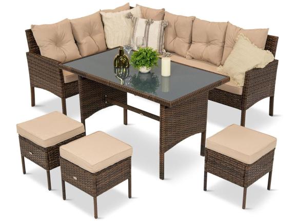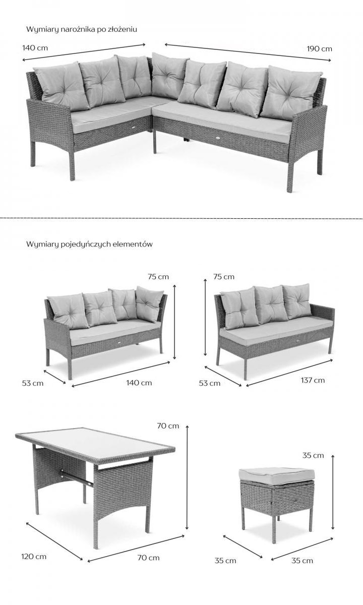 Setul pentru grădină din technorattan prezentat este un set format dintr-o canapea formată din două module, trei pufe și o masă. Mobilierul prezentat este un set multifuncțional - va fi perfect ca un set de relaxare, datorită colțarului confortabil, dar este, de asemenea, o soluție bună dacă suntem în căutarea unui set de servit masa pentru grădină - setul este dotat cu o masă înaltă, mare, cu un blat de sticlă, ideală pentru a servi masa în aer liber. Formele clasice, geometrice ale mobilierului fac ca setul să se integreze perfect la spațiul din grădină.