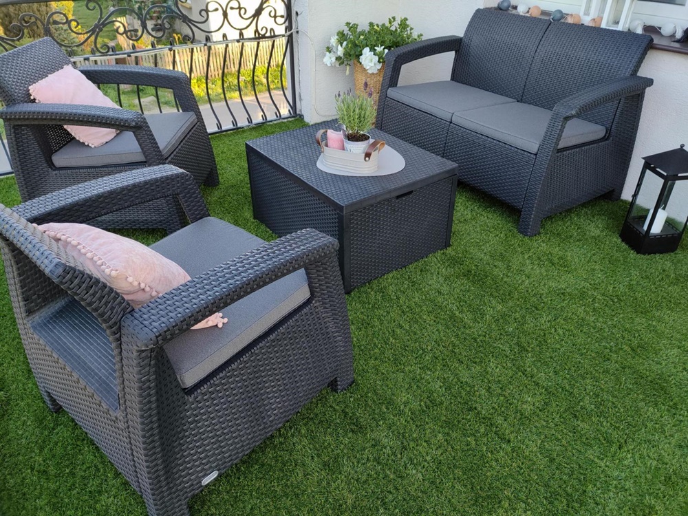 Mobilierul Corfu este o alegere excelentă pentru cei care apreciază forma și confortul original, original. Se potrivesc perfect pe terasa noastră mică. Materialul de bună calitate și manopera solidă îi fac pe toți să se simtă în siguranță. În plus, cufărul este foarte încăpător și poate găzdui cu ușurință perne și alte comori ;) Îl recomand cu drag!