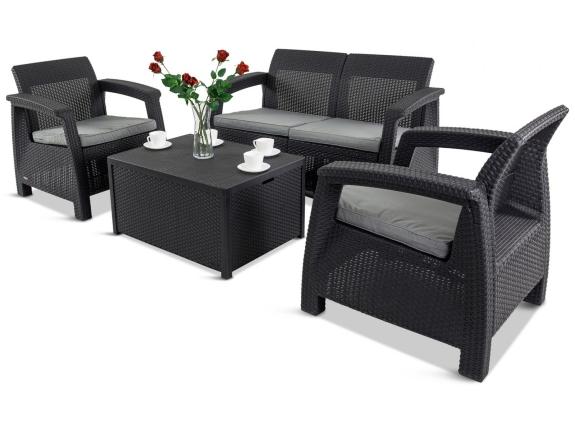 Corfu Box este un set dedicat pentru 4 persoane, care include: o canapea cu două locuri, două fotolii și o masă - cufăr practică. Masa practică vă va oferi un loc pentru a depozita perne sau alte obiecte mici, cum ar fi pături, decorațiuni sau ustensile de grădină. Orificiile de pe laterale facilitează deplasarea mesei.