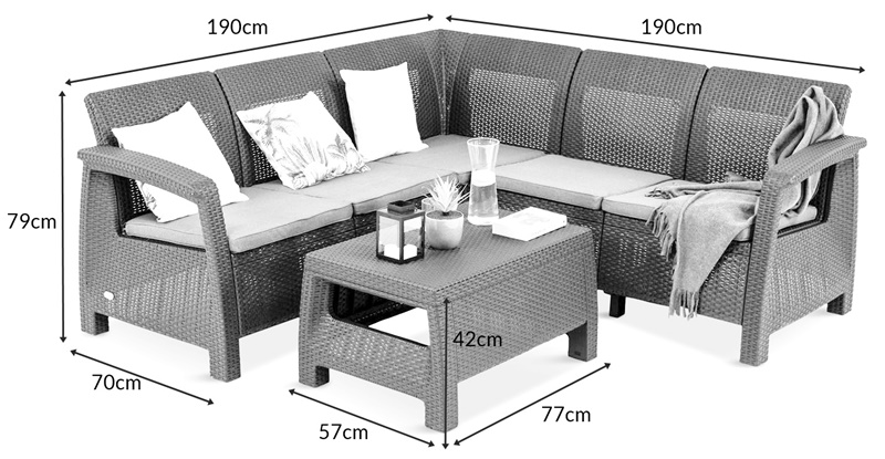 Setul de mobilier de gradină prezentat Corfu Relax conține un colțar cu dimensiunile 190x190 cm care va oferi suficient spațiu pentru 5 persoane și o măsuță de cafea practică. Spătarul profilat și cotierele late vor oferi un loc confortabil de odihnă. În timpul procesului de productie, materialul din care a fost realizat mobilierul a fost modelat în asa fel încat să semene cu modelul unei împletituri de tehnorattan, care conferă întreaga eleganță.