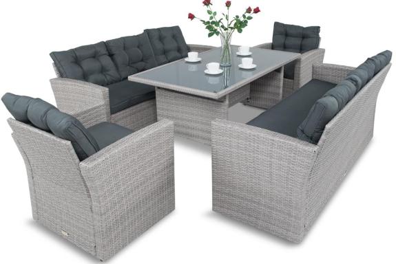 Setul de mobilier de grădină prezentat este un set format din două canapele cu trei locuri, două fotolii și o masă de servit cu blat din sticlă securizată. Mobilierul este perfect pentru terase și grădini, în special pentru iubitorii întâlnirilor de weekend cu familia și prietenii. Setul mare de mobilier de grădină arată foarte impresionant, iar șezuturile cu perne moi crește confortul de relaxare. Formele clasice, geometrice ale mobilierului facilitează asortarea setului la spațiul sau amenajarea dvs.