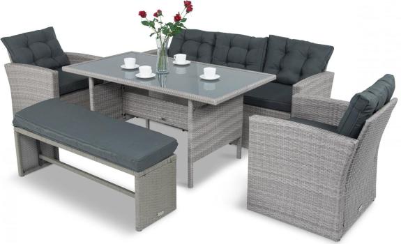 Setul de mobilier de grădină prezentat este un set format din o canapea cu trei locuri, două fotolii, un scaun-bancuță și o masă de servit cu blat din sticlă securizată. Setul este completat cu perne confortabile pentru fiecare șezut și spătar. Setul prezentat se alătură celor mai recente tendințe în designul mobilierului de grădină și, datorită utilizării nuanțelor neutre, nu există nicio dificultate în a-l asorta la diverse aranjamente.