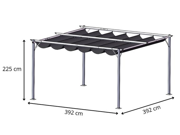 Pergola simplă pentru terasă are dimensiunea de 392 cm lățime și 392 cm lungime iar înălțimea este de 225 cm. Pergola de grădină are acoperiș rabatabil practic din material de poliester, în timp baza structuri a pergolei este un cadru din oțel vopsit cu pulbere.