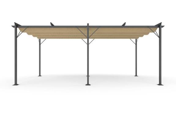 Pergola simplă pentru terasă are dimensiunea de 556 cm lățime și 292 cm lungime iar înălțimea este de 225 cm. Pergola de grădină are acoperiș rabatabil practic din material de poliester, în timp baza structuri a pergolei este un cadru din oțel vopsit cu pulbere.