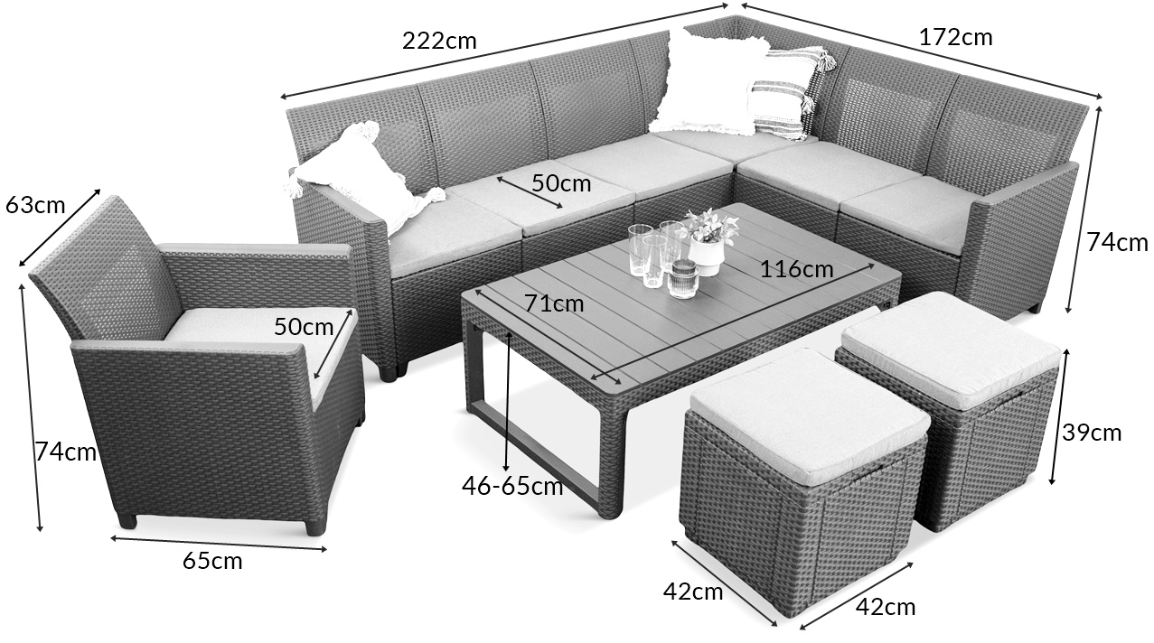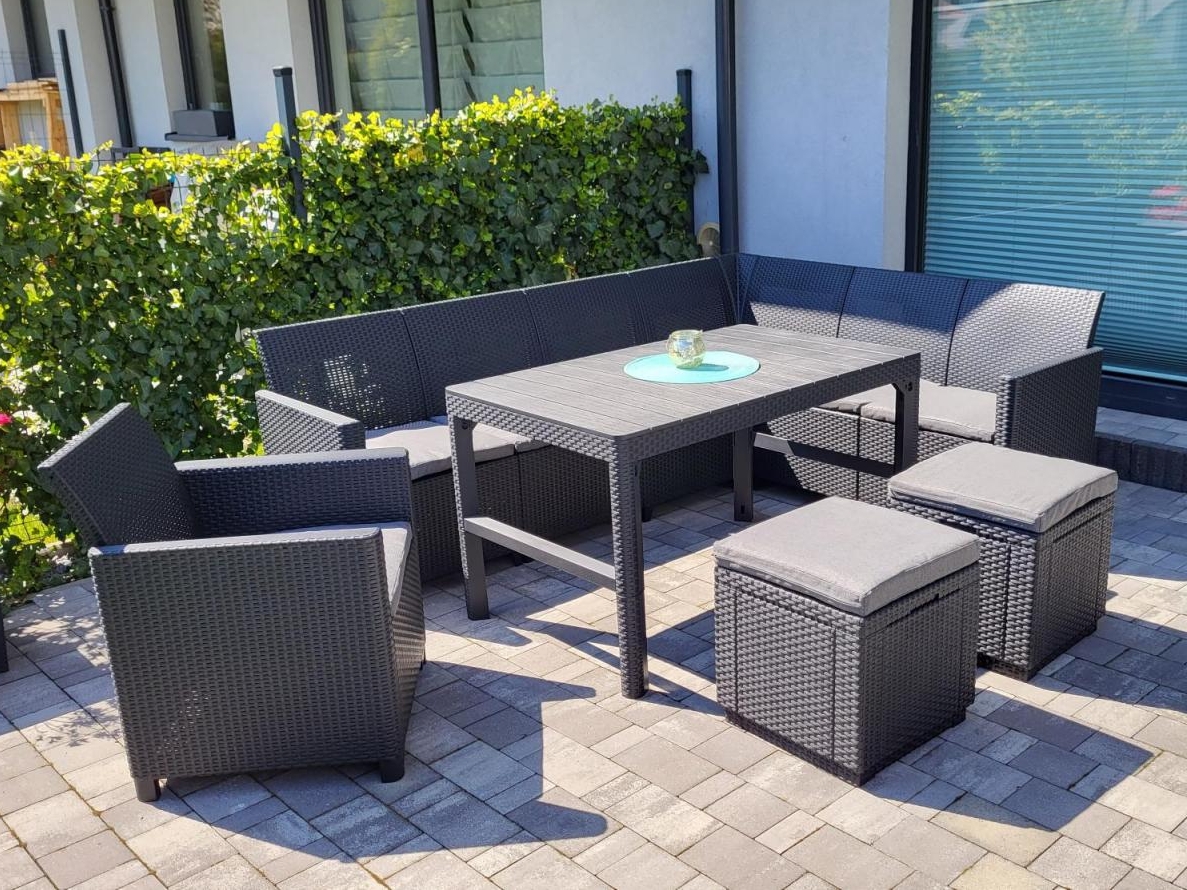 Setul de mobilier de grădină oferit este o îmbinare perfectă între funcționalitate și design modern. Setul include o masă cu înălțime reglabilă, o canapea mare de tip colțar, un fotoliu și două poufuri care au depozitare sub șezut. Setul este dotat cu perne pentru fiecare șezut. Scaunele din set imită technorattanul împletit, în timp ce blatul mesei și cotierele fotoliilor sunt realizate pentru a imita lemnul. Spătarul înalt și pernele moi ale șezutului asigură un confort optim atunci când utilizați mobilierul.