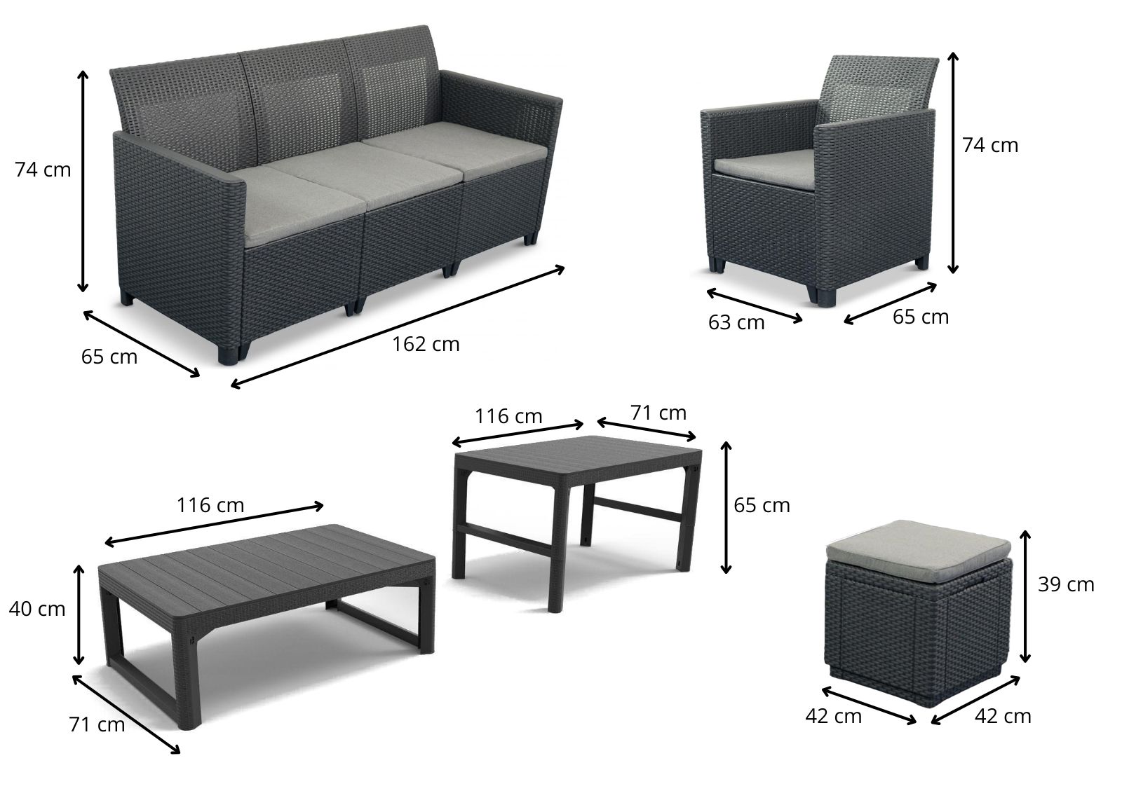 Setul de mobilier de grădină K3L cu poufuri este o propunere pentru cei care apreciază confortul și funcționalitatea. Setul include o masă cu reglare pe înălțime, o canapea cu trei locuri, două fotolii și două poufuri. Setul include perne pentru șezut. Poufurile au compartimente de depozitare sub șezut. Mobilierul este realizat în întregime din plastic, care imită perfect împletitura de tehnorattan. Blatul mesei și cotierele fotoliilor arată ca și cum ar fi realizate din lemn. Spătarul înalt și profilat iar pernele moi de pe șezut asigură confort și comoditate la utilizarea mobilierului.