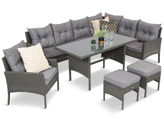 Setul de mobilier din tehnorattan prezentat este o propunere care va satisface așteptările chiar și ale celor mai exigenți clienți. Setul include o masă mare dreptunghiulară de 120 cm lungime, unul fotel, două poufuri și o canapea de tip colțar formată din două canapele duble, un modul central și un modul de colț. Datorită structurii modulare, colțarul poate fi orientat spre stânga sau spre dreapta. Atunci când modulele sunt asamblate, dimensiunile totale ale colțarului sunt de 215x165 cm. Pentru fiecare șezut și spătar sunt prevăzute o perne confortabile. Setul este fabricat din materiale de foarte bună calitate, cu cea mai mare atenție la detalii. Acest mobilier este potrivit nu numai pentru exterior, ci și pentru interior.
