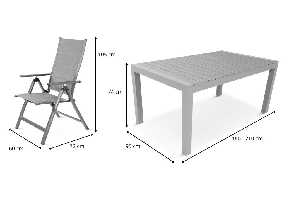 Setul de grădină este din aluminiu și este prevăzut cu o masă mare pliantă Tanami. Partea superioară a mesei poate fi extinsă - astfel putem crește lungimea acesteia de la 160 cm la 210 cm, creând spațiu pentru până la 12 persoane! Acest lucru va fi deosebit de util pentru evenimente mari de familie. Extinderea mesei în sine este extrem de ușoară și comodă - elementul suplimentar este mascat sub blat, astfel încât depozitarea sa nu reprezintă o problemă. Pentru a mări dimensiunea mesei, pur și simplu așezați-o pe glisiere. Este important de menționat faptul că masa are o blocare a extensiei, care este o protecție împotriva mișcării nedorite a glisierelor, de exemplu, atunci când mutați masa. Suprafața mesei este acoperită cu lamele maro din lemn de poliwood. Acesta este un material plastic rezistent care seamănă vizual cu lemnul. Acest detaliu nu este doar o soluție practică, ci dă și un aspect elegant și modern mobilierului. Datorită materialelor utilizate, masa Tanami este ușor de curățat, ceea ce este deosebit de important pentru o masă. Dacă se murdărește, de regulă este suficient să o ștergeți cu o lavetă umedă.