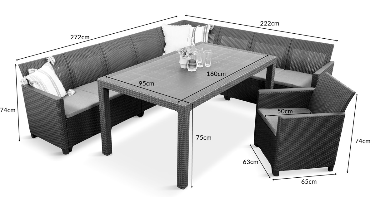 Masa de cină cu dimensiunile blatului 160x95 va oferi cantitatea potrivită de spațiu pentru a servi masa și băuturi. Stabilitatea este asigurată de întăriri metalice sub blat. Înălțimea mesei este de 75 cm – asigurând luarea meselor confortabil în combinație cu canapea și fotoliile. În partea centrală a blatului, există un orificiu care vă permite să introduceți o umbrelă.