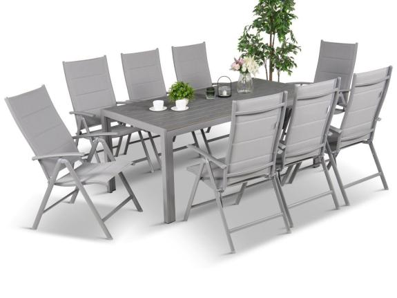 Setul de terasa prezentat este format dintr-o masa de servit cu suprafata de 180x90cm și 8 scaune. Mobilierul este realizat intr-un stil modern - se va potrivi cu terasele și balcoanele urbane moderne. Designul minimalist îl deosebește de alte seturi și îl face excepțional de atractiv.