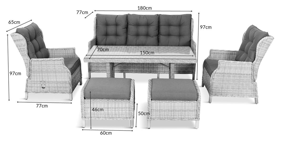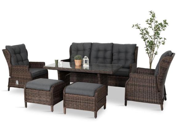 Acest set de mobilier din tehnorattan prezentat este o propunere de mobilier de gradina premium durabil si elegant. Setul descris include o canapea mare, cu trei locuri, 180 cm lungime, doua fotolii cu spatar reglabil, doua pufe si o masa mare dreptunghiulara de 150 cm lungime. Fiecare șezut și spătar are perne confortabile. Setul este fabricat din componente de cea mai înaltă calitate, care garantează rezistența și durabilitatea mobilierului pentru ani de zile..