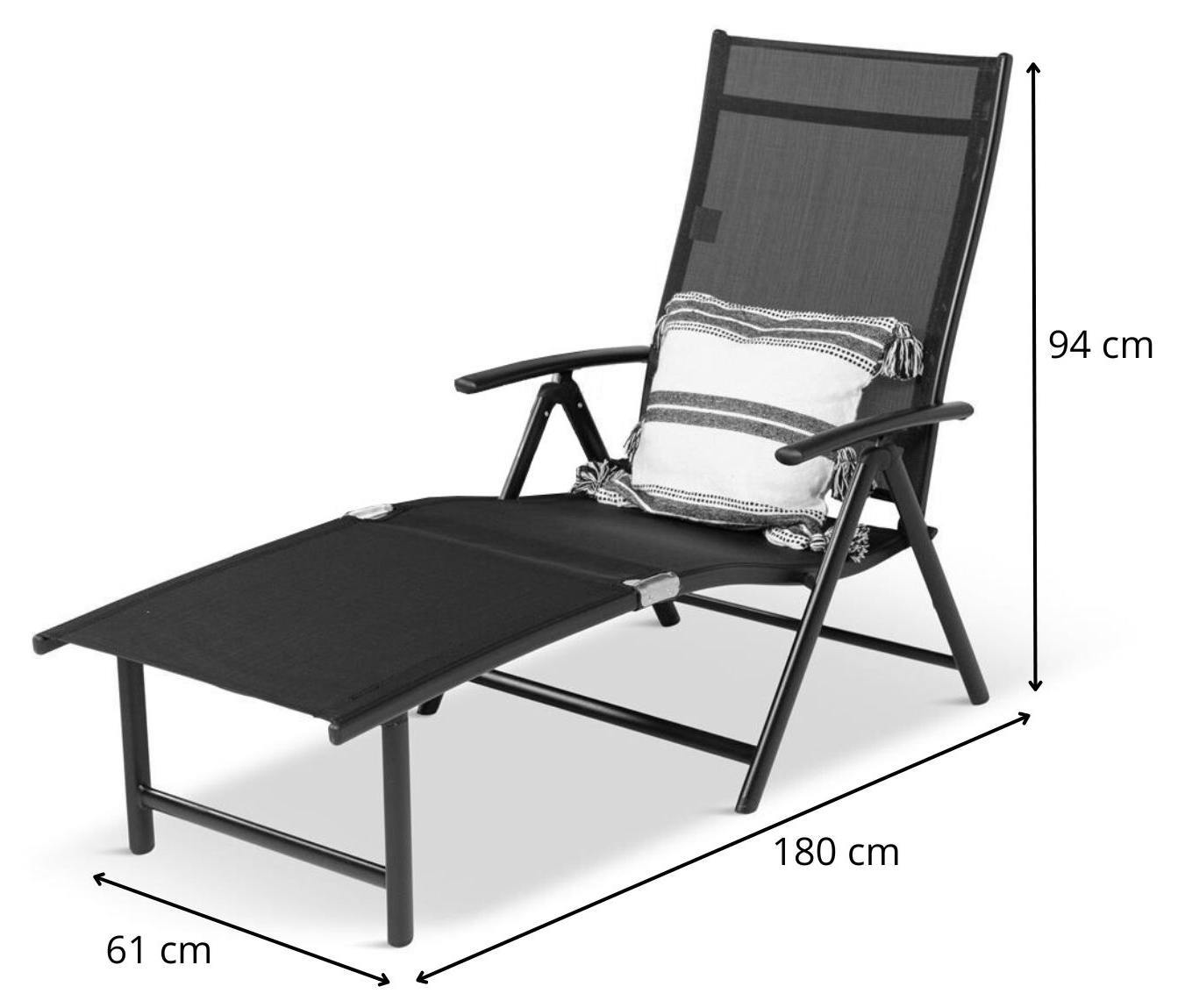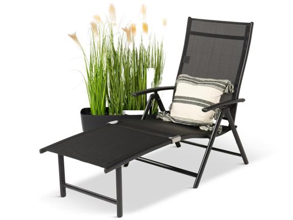 Șezlongul de grădină este fabricat din materiale solide de culoare neagră. Cadrul șezlongului este fabricat din aluminiu, care a fost protejat prin vopsire cu pulbere. Aluminiul se caracterizează prin ușurința sa, făcând șezlongul ușor de transportat. Șezlongul are întărituri orizontale suplimentare care stabilizează structura. Acest lucru permite o sarcină maximă de până la 130 kg! Suprafața șezutului este o țesătură textilenă cu ochiuri puternice, de culoare neagră. Acest tip de țesătură flexibilă asigură un flux de aer și, în același timp, este rezistent la condițiile meteorologice nefavorabile. Confortul suplimentar atunci când vă relaxați la soare este adăugat de cotiere, pe care vă puteți sprijini brațele sau puteți agăța un prosop. Șezlongul Kubu este o alegere excelentă pentru cei care apreciază soluțiile simple și practice.