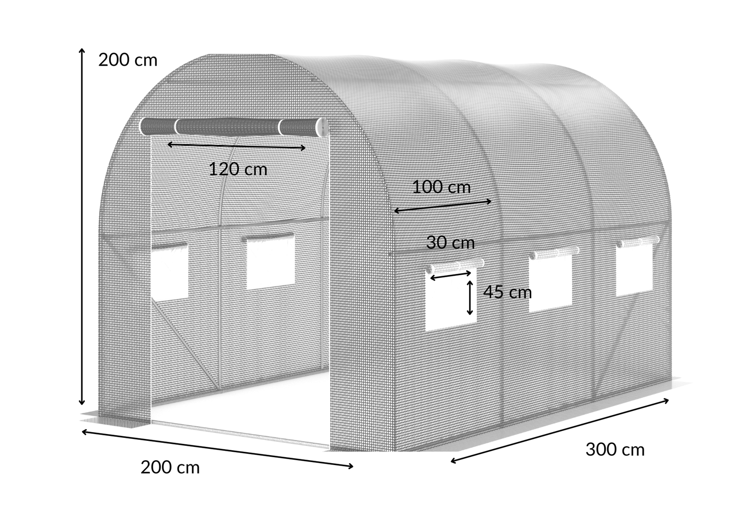 Fiecare modul al tunelului de folie pe cadru metalic are ferestre rulante de 45x30 cm - câte trei pe fiecare parte pentru un total de șase ferestre. Acestea se rulează fără efort în sus dacă interiorul trebuie ventilat. Mulțumită utilizarea ferestrelor cu plase pentru țânțari, ne asigurăm că culturile noastre beneficiază de reglarea corectă a temperaturii, a umidității și a circulației aerului, atât cât au nevoie legumele plantate.