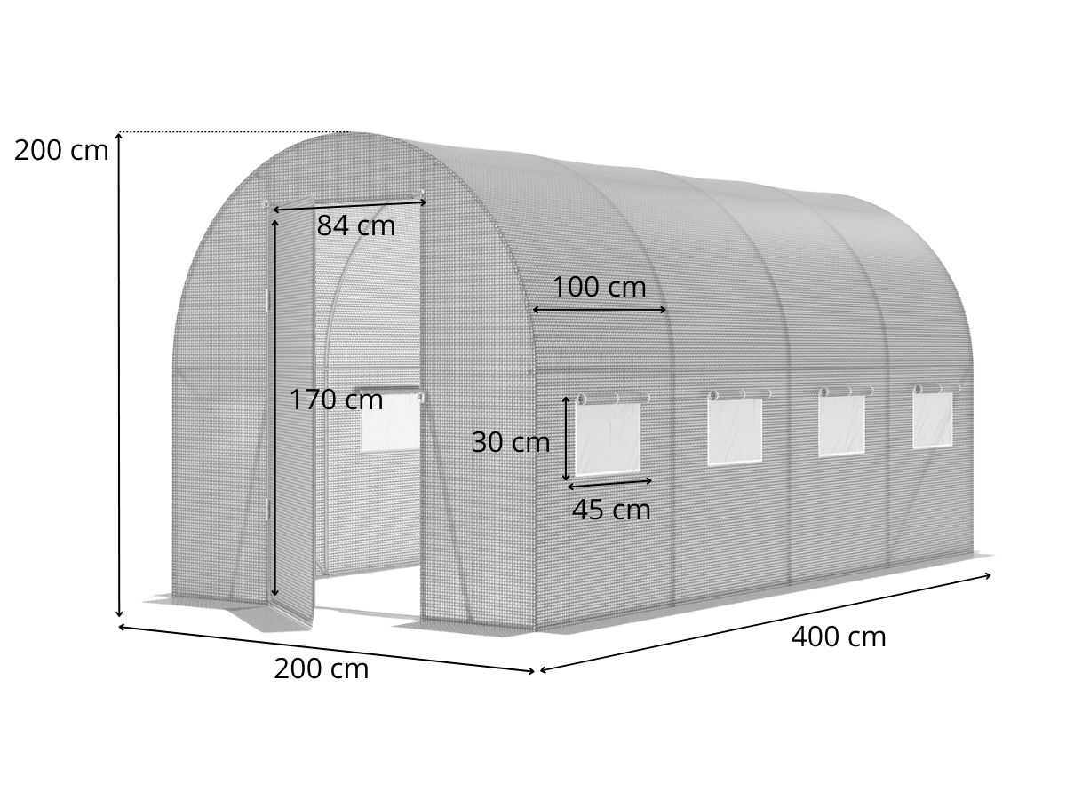 Solarul tip tunel pentru grădină cu cadru metalic are o lățime de 2 m și o lungime de 4 m, astfel încât suprafața totală de cultivare este de 8 m2. Orice tip de cultură va prospera sub o astfel de protecție: fructe, legume și, de asemenea, flori ornamentale. Chiar și în caz de vreme nefavorabilă, plantele vor crește bine. Tunelul cu folie are o înălțime de 2m, astfel încât să puteți munci în poziție dreaptă și să faceți activități de grădină confortabil, chiar și pentru persoanele mai înalte. Ușile metalice de 84x170 cm de pe o parte a tunelului permit intrarea sau ieșirea comodă. Acestea garantează accesul rapid la interior fără a fi nevoie să rulați în sus și în jos ușa cu fermoar. O intrare rulantă lată de 120 cm pe cealaltă parte a tunelului permite introducerea în interior a uneltelor mari sau a vaselor. Construcția solidă protejează în mod corespunzător plantele de intruși și de vânt.